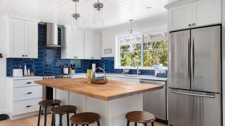 Die Küche im Ferienhaus ist voll ausgestattet und verfügt über einen Kühlschrank sowie einen Geschirrspüler, wodurch eine Selbstverpflegung möglich ist.