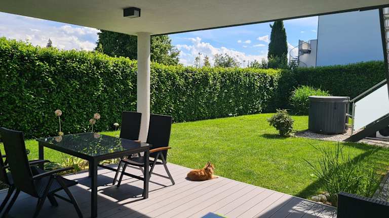 Die Ferienwohnung verfügt über 2 Schlafzimmer, 1 Badezimmer, Bettwäsche, Handtücher, einen Flachbild-TV, einen Essbereich, eine voll ausgestattete Küche und eine Terrasse mit Gartenblick.