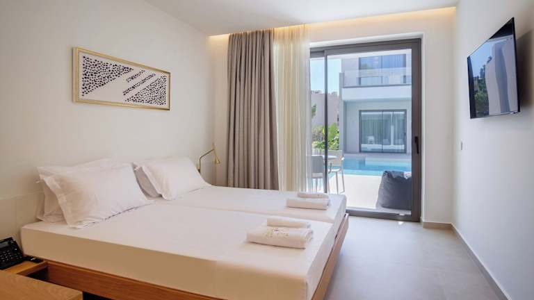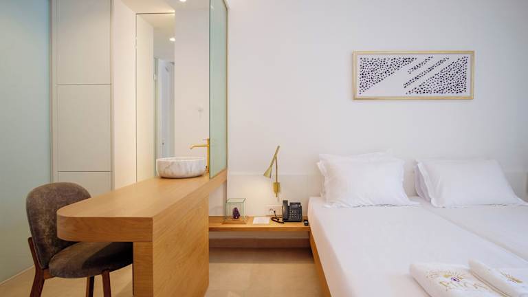 Die klimatisierten Zimmer des Phos Hotel Adults Only sind mit einem Schreibtisch, einer Kaffeemaschine, einem Kühlschrank, einem Safe, einem Flachbild-TV, einer Terrasse und einem eigenen Badezimmer mit Dusche ausgestattet. Einige Zimmer bieten einen Blick auf das Meer, und alle sind mit einem Balkon sowie mit Bettwäsche und Handtüchern versehen.