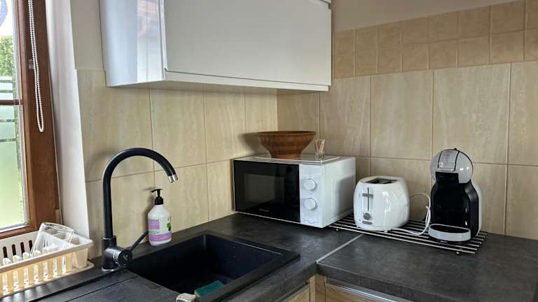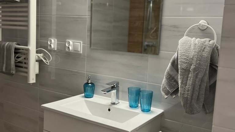 Das klimatisierte Ferienhaus im Piękna Góra verfügt über ein Schlafzimmer, ein Wohnzimmer, eine voll ausgestattete Küche mit Kühlschrank und Wasserkocher sowie zwei Badezimmer mit Dusche und Whirlpool. Handtücher und Bettwäsche werden gestellt, um Ihnen einen angenehmen Aufenthalt zu ermöglichen.
