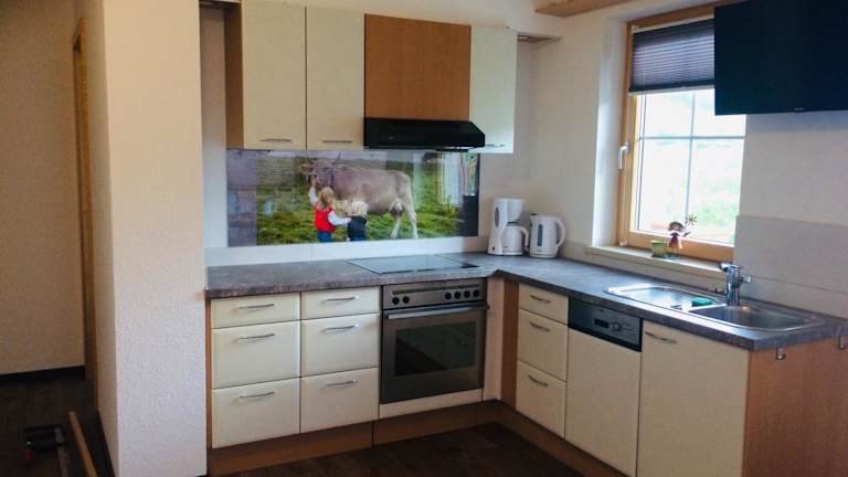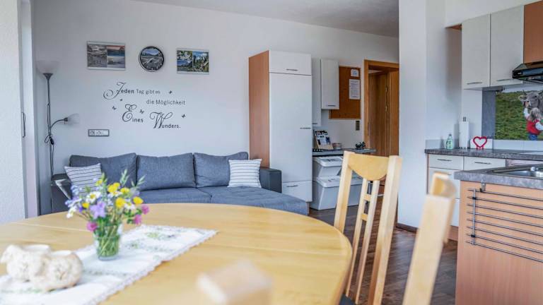 Die Ferienwohnung umfasst 2 Schlafzimmer, 1 Badezimmer, einen Essbereich sowie eine voll ausgestattete Küche. Zur Ausstattung gehören Bettwäsche, Handtücher und ein Flachbild-TV mit Satellitenkanälen. Eine Terrasse mit Blick auf die Berge ergänzt das Angebot.