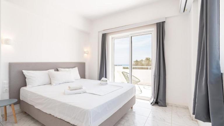 Die Unterkunft bietet moderne Apartments mit kostenlosem WLAN, einer Klimaanlage und einem Zugang zu einem Garten mit einem saisonalen Außenpool. Die Apartments verfügen über eine Terrasse mit Meerblick.