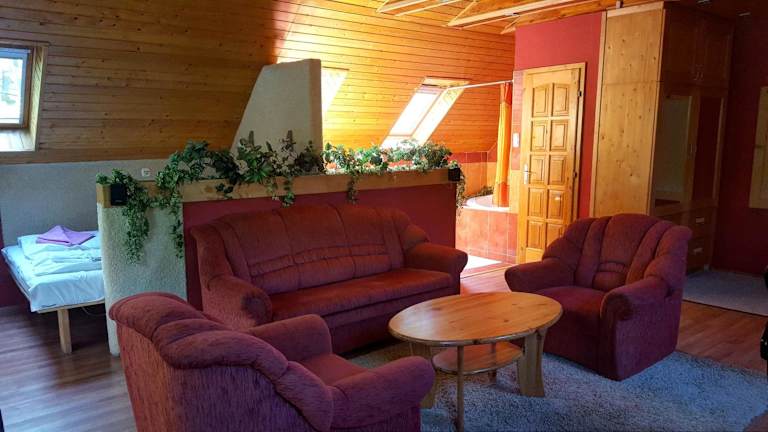 Das Platán Panzió bietet komfortable Zimmer mit Sat-TV und einem Kühlschrank. Jedes Zimmer verfügt über ein eigenes Badezimmer und einige Zimmer bieten auch einen separaten Wohnbereich mit einem Sofa. Die Unterkunft ist ideal für einen entspannten Aufenthalt inmitten der Natur.