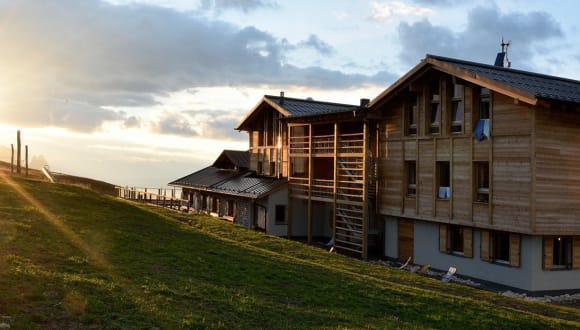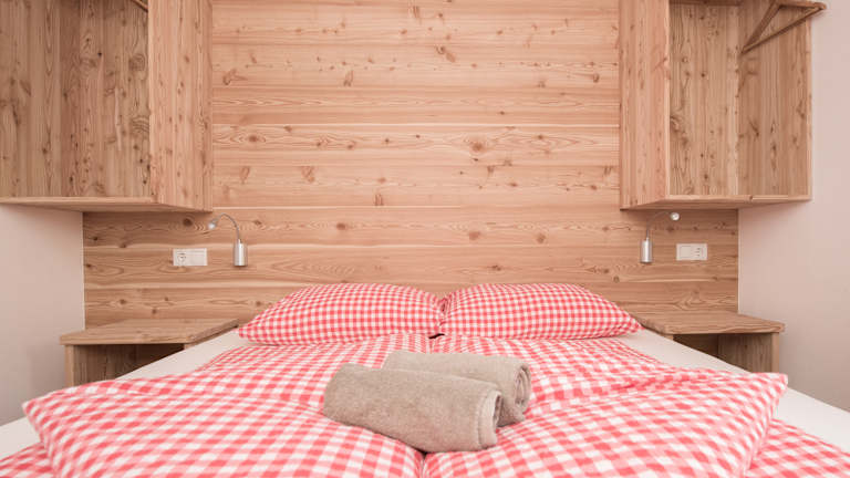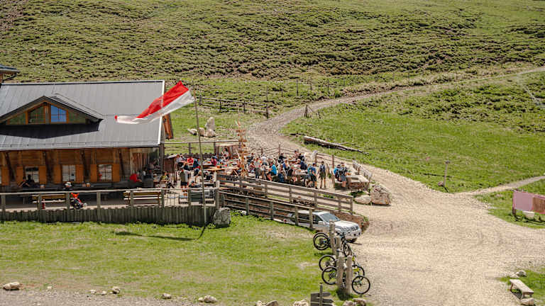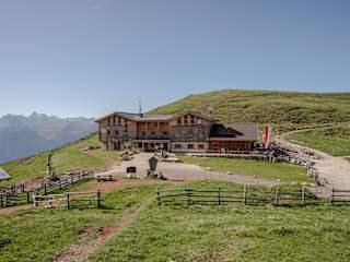 Kinder können sich auf dem Spielplatz, der Slackline und der Almwiese vor der Hütte austoben. Im Aufenthaltsraum mit Bibliothek lässt es sich entspannen.