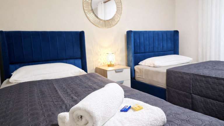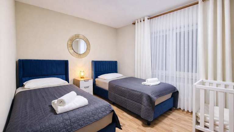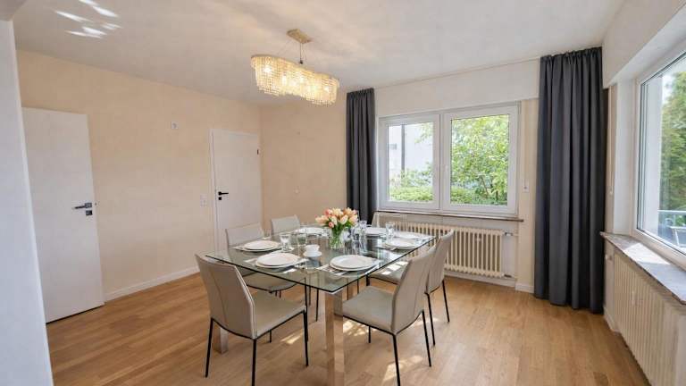 Die Ferienwohnung umfasst zwei Schlafzimmer und ein Wohnzimmer. Die Ausstattung beinhaltet einen Flachbild-TV sowie eine gut ausgestattete Küche mit Kühlschrank und Geschirrspüler. Das Badezimmer verfügt über eine Badewanne. Handtücher und Bettwäsche werden bereitgestellt. Für zusätzliche Annehmlichkeiten sorgen eine Veranda und ein Balkon.