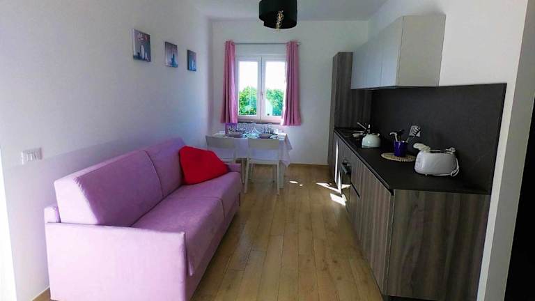 Die Ferienwohnung umfasst ein Schlafzimmer, ein Wohnzimmer und eine voll ausgestattete Küche mit Kühlschrank und Kaffeemaschine. Das Bad ist mit einer Dusche und einem Bidet ausgestattet. Handtücher und Bettwäsche werden bereitgestellt. Die Unterkunft ist klimatisiert.