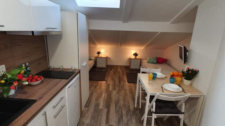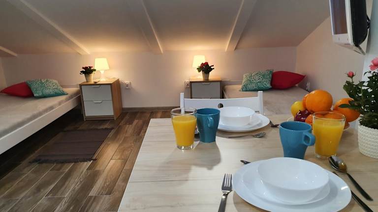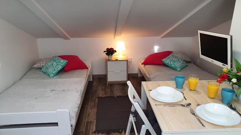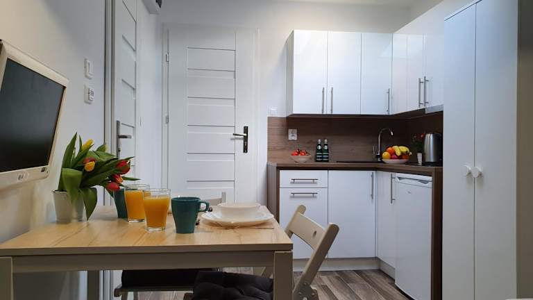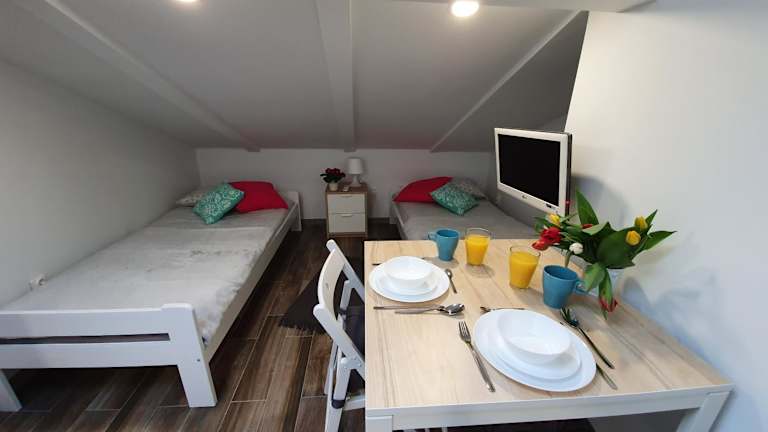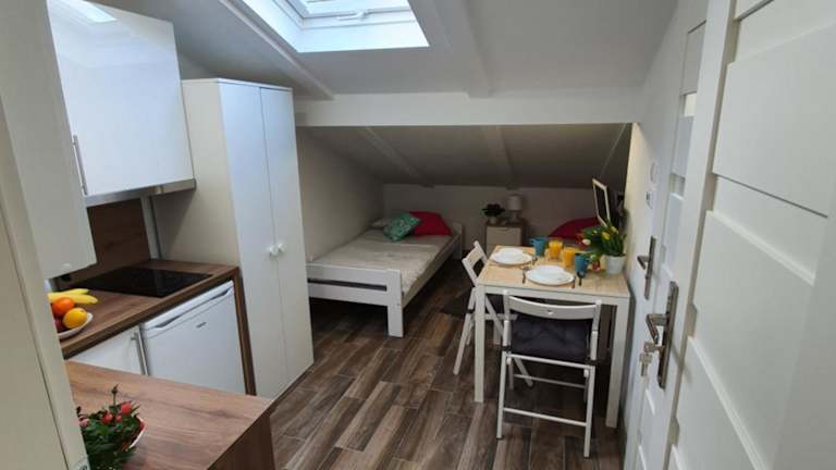 Die Unterkunft Pokoje na poddaszu czwarte piętro Ustka bietet eine angenehme Atmosphäre und ist in einem voll ausgestatteten Zustand. Es handelt sich um eine Dachgeschossunterkunft, die einen Blick auf die Umgebung ermöglicht.