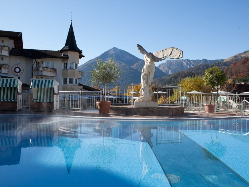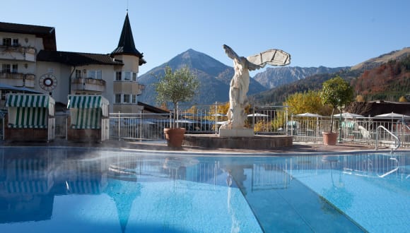 Genießen Sie Auszeit und Wohlsein in der exklusivsten Bade- und Saunalandschaft Tirols (7000m²) sowie beim meditativen Saunieren im „Versunkenen Tempel“. Oder entspannen Sie in den Sole-Außenbecken (34°), die den Blick auf die Berggipfel und den hoteleigenen 9-Loch-Golfplatz frei geben.