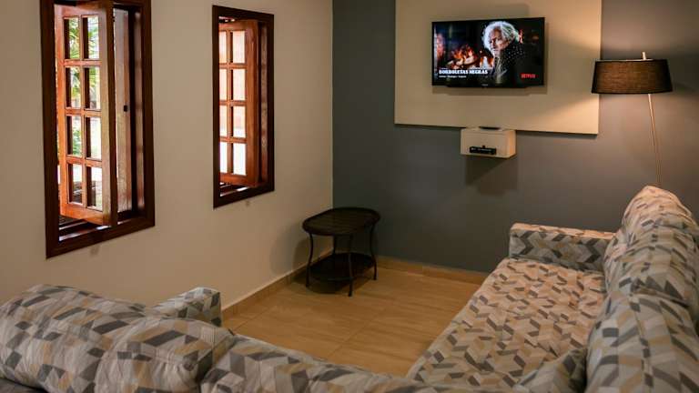 Jedes Zimmer in der Pousada e Restaurante Terra Rossa ist mit Klimaanlage, einem Sitzbereich, einem Flachbild-TV mit Satellitenkanälen, einer Küchenzeile, einem Essbereich und einem eigenen Badezimmer ausgestattet. Die Zimmer sind ebenfalls mit Bettwäsche und Handtüchern versehen.
