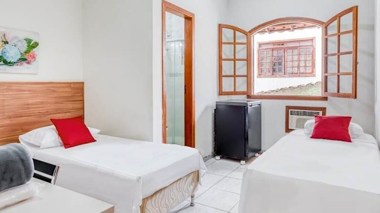 Die Zimmer im Pousada Lagoa sind klimatisiert und strahlen eine helle Atmosphäre aus. Sie sind im kolonialen Stil eingerichtet und verfügen über eine Minibar, einen TV und ein eigenes Bad mit Dusche. Zur Ausstattung gehören auch ein Schreibtisch und ein gemütlicher Sitzbereich.