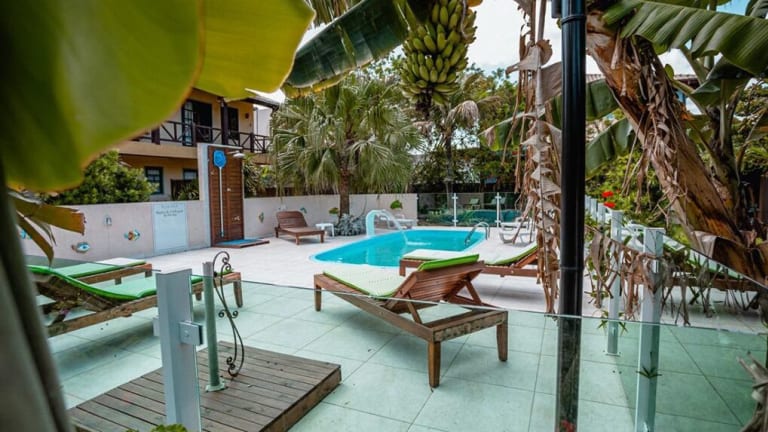 Das Pousada Santa Genoveva in Florianópolis ist eine ideale Wahl für einen entspannten Aufenthalt in der Nähe des Praia do Campeche. Mit einem Außenpool, kostenfreien Privatparkplätzen und einem charmanten Garten bietet die Unterkunft alles, was Sie für einen angenehmen Urlaub benötigen. Die Zimmer sind komfortabel eingerichtet und verfügen über Annehmlichkeiten wie einen Balkon mit Seeblick und einen Flachbild-TV. Genießen Sie die Gemeinschaftsküche und den Grillbereich des Gasthauses. WLAN steht Ihnen im gesamten Gebäude kostenfrei zur Verfügung. Erkunden Sie die umliegenden Einkaufszentren und Sehenswürdigkeiten oder entspannen Sie einfach am nahe gelegenen Strand.