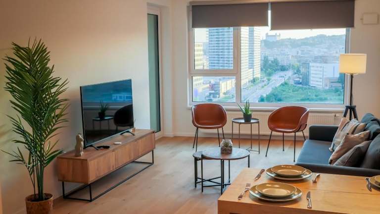 Die Unterkunft Premium new apartment with panoramic castle view bietet einen Stadtblick, eine Terrasse und einen kostenlosen Privatparkplatz. Die Ferienwohnung zeichnet sich durch ihre Lage mit Panoramablick auf ein Schloss aus.