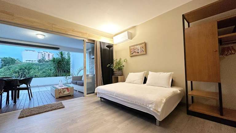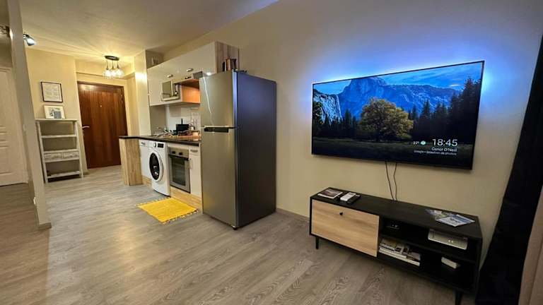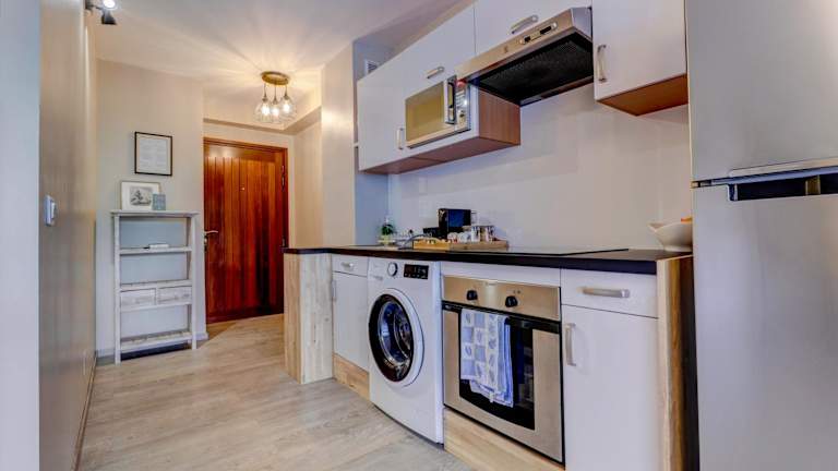 Die Ferienwohnung besteht aus einem Schlafzimmer, einem Wohnzimmer und einer voll ausgestatteten Küche, die mit einem Kühlschrank und einer Kaffeemaschine ausgestattet ist. Das Badezimmer beinhaltet eine Dusche und kostenlose Pflegeprodukte. Es werden Handtücher und Bettwäsche zur Verfügung gestellt.