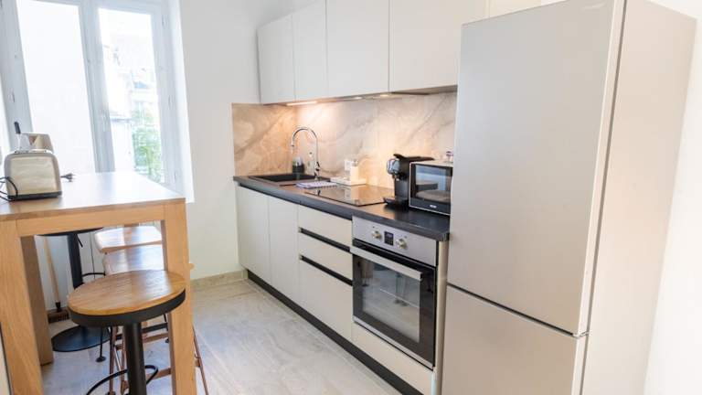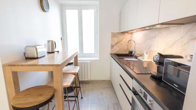 Die Ferienwohnung umfasst eine voll ausgestattete Küche mit einem Kühlschrank und einer Kaffeemaschine, was den Gästen die Möglichkeit gibt, eigene Mahlzeiten zuzubereiten.