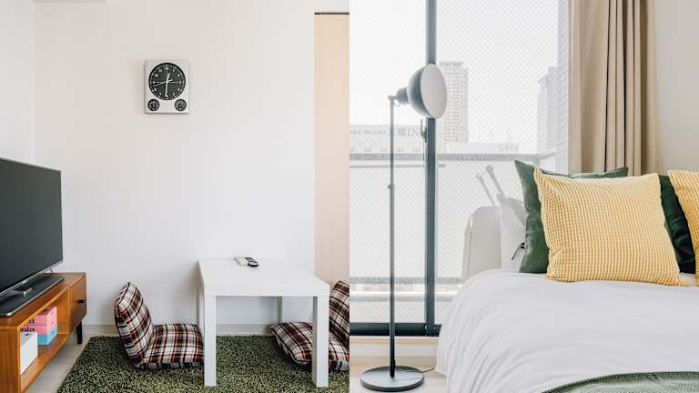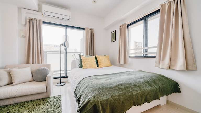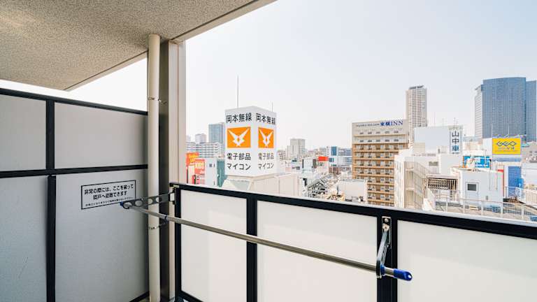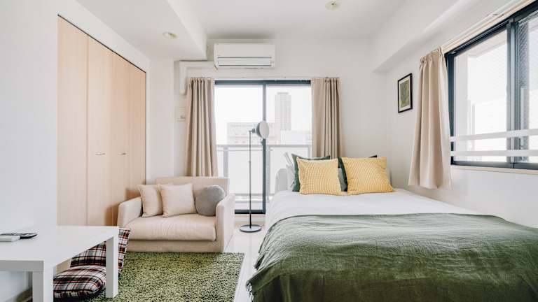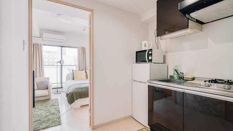Das Apartment bietet ein gemütliches Schlafzimmer, ein Badezimmer und Annehmlichkeiten wie Bettwäsche, Handtücher und einen Flachbild-TV. Der Essbereich und die voll ausgestattete Küche bieten Ihnen die Möglichkeit, Ihre eigenen Mahlzeiten zuzubereiten und zu genießen. Der Balkon und die Terrasse bieten einen herrlichen Blick auf die Stadt und sind der perfekte Ort, um sich zu entspannen und die Atmosphäre von Osaka zu genießen.