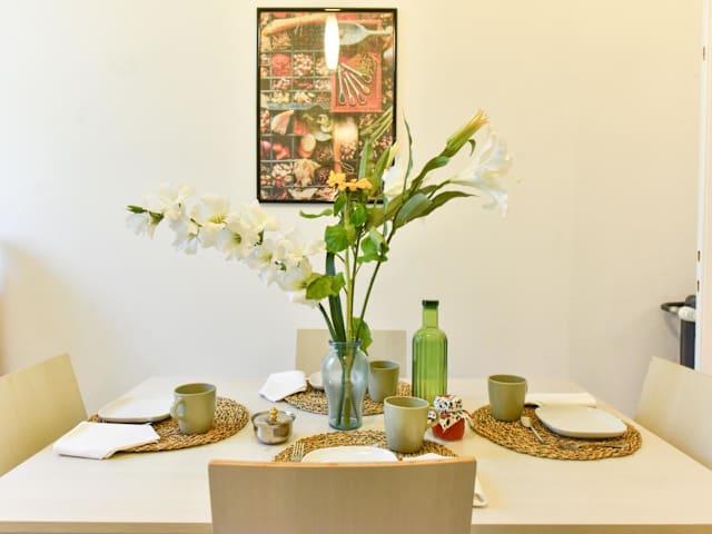 Die Ferienwohnung umfasst 2 Schlafzimmer und 1 Badezimmer sowie einen Essbereich. Die Ausstattung beinhaltet Bettwäsche, Handtücher, einen Flachbild-TV, eine voll ausgestattete Küche und einen Balkon mit Gartenblick.