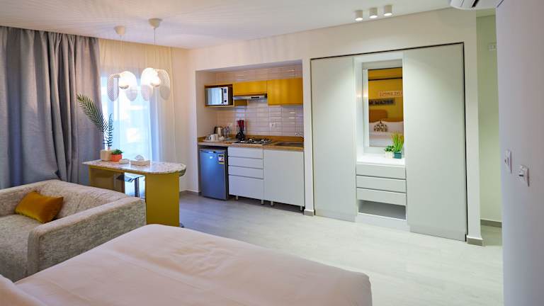 Das Hotel bietet keine eigenen Restaurants, aber in der voll ausgestatteten Küchenzeile in den Apartments können Sie Ihre eigenen Mahlzeiten zubereiten. Alternativ finden Sie in der näheren Umgebung verschiedene Restaurants und Cafés, in denen Sie lokale und internationale Küche genießen können.