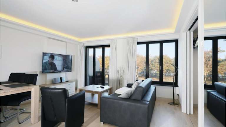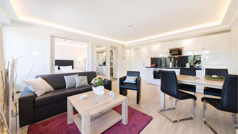 Die Wohnung verfügt über 1 Schlafzimmer und ein Wohnzimmer. Zur Ausstattung gehören ein TV sowie eine gut eingerichtete Küche mit Kühlschrank und Geschirrspüler. Das Badezimmer ist mit einer Dusche ausgestattet, außerdem gibt es einen Balkon mit Blick aufs Meer.