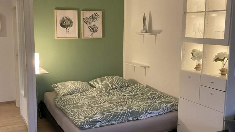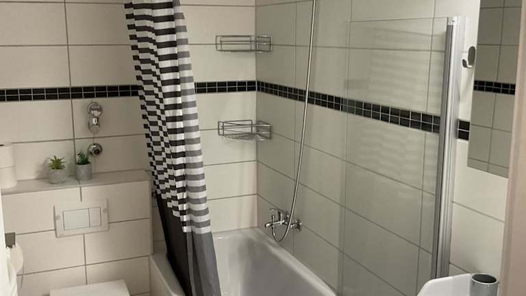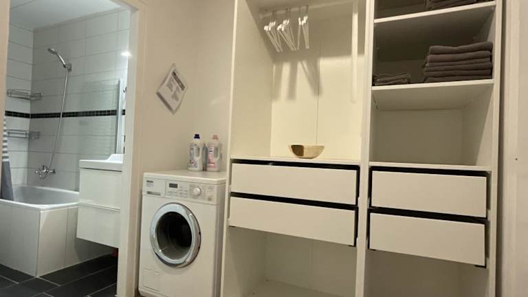 Die Ferienwohnung verfügt über ein Schlafzimmer, eine voll ausgestattete Küche mit Kühlschrank, einen Sitzbereich sowie eine Waschmaschine. Das Badezimmer ist sowohl mit einer Dusche als auch mit einer Badewanne ausgestattet.