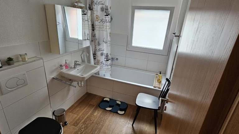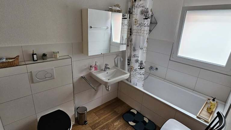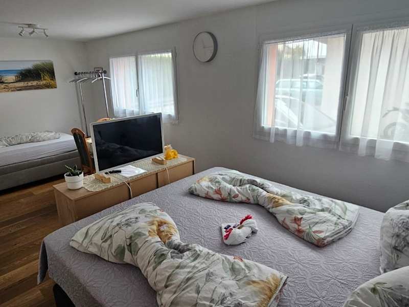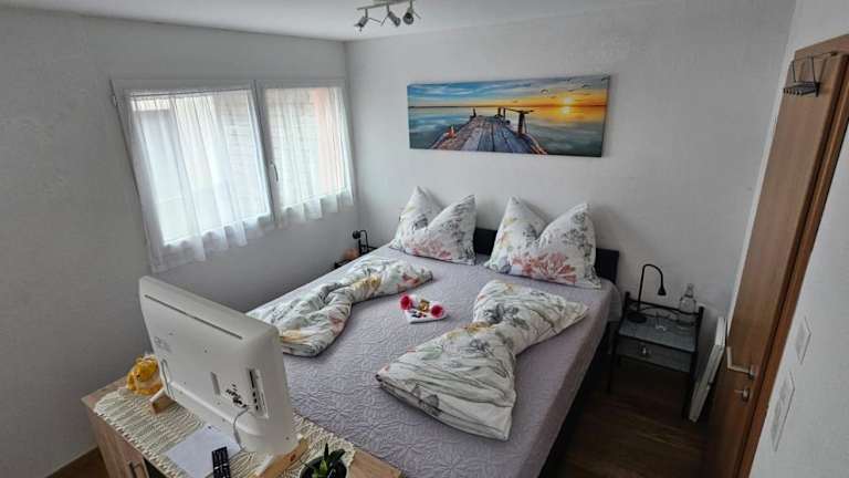 Die Ferienwohnung umfasst ein Schlafzimmer und ein Badezimmer mit Badewanne oder Dusche. Zur Ausstattung gehören ein Flachbild-TV mit Kabelkanälen sowie Handtücher und Bettwäsche.
