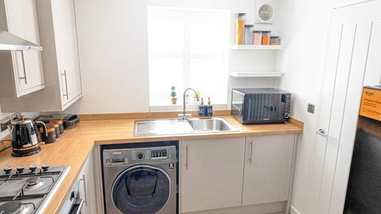 Eine Gemeinschaftsküche ist vorhanden, ausgestattet mit Kühlschrank, Ofen und Mikrowelle.
