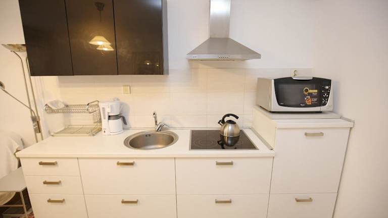 Die Ferienwohnung verfügt über eine gut ausgestattete Küche mit Kühlschrank, Mikrowelle und Herdplatte, ideal zur Selbstverpflegung. Kostenlose Pflegeprodukte sind ebenfalls vorhanden.