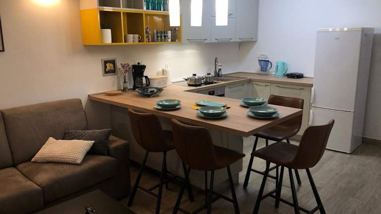 Die Ferienwohnung verfügt über 2 Schlafzimmer und ist klimatisiert. Sie bietet eine Küche, einen Sitzbereich und einen Flachbild-TV sowie einen Balkon.