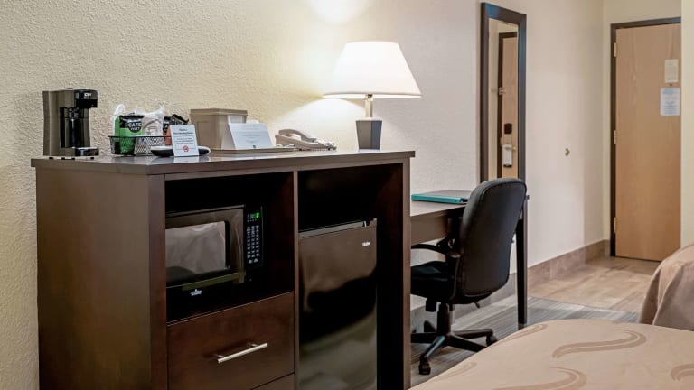 Das Quality Inn & Suites verfügt über 50 Zimmer, die alle mit einer Klimaanlage ausgestattet sind, um Ihnen einen angenehmen Aufenthalt zu ermöglichen. Zur Standardausstattung gehören auch ein Kühlschrank, eine Mikrowelle und eine Tee-/Kaffeemaschine. WLAN und ein TV-Gerät sorgen für Unterhaltung. Im Badezimmer steht ein Haartrockner zur Verfügung.