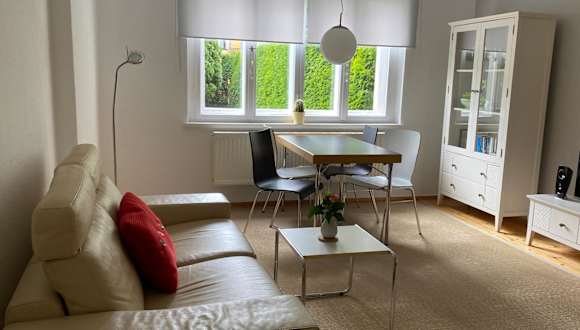 Die Wohnung verfügt über ein Schlafzimmer, ein Wohnzimmer mit einem Flachbild-TV, eine gut ausgestattete Küche mit Kühlschrank und Geschirrspüler sowie ein Badezimmer mit Dusche. Handtücher und Bettwäsche werden bereitgestellt.