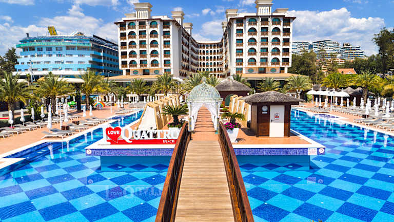Es befinden sich insgesamt 438 Zimmer meerblick und Seitlich meerblick Das Hauptrestaurant bietet im geschlossenen Bereich Platz für 450 Personen und im offenen Bereich auf der Terrasse Platz für 800 Personen. Das Mexikan a’la Carte Restaurant bietet Platz für 50 Personen, Fish a’la carte Restaurant für 35 Personen, Quattro Italian A’la Carte Restaurant für 50 Personen. Im Beach Restaurant, im Caffe De Quattro Patisseria, an der Beach Bar, Lobby Lounge Bar, a’la Carte Bar und der Pool Bar werden den ganzen Tag über reichliche Sorten von Essen und Getränken serviert. Das Hotel verfügt über vier voneinander unabhängige Swimmingpools, zwei Konferenzräume und Ballsäle; Hallenbad, Fitnesscenter; Türkischen Hamam. Im Hotel bieten ein Geschäft , Geschenkartikel Geschäft, Friseur, Leder Boutiqe, Handtaschen Geschäft, Fotogeschäft ihre Dienstleistungen an.
