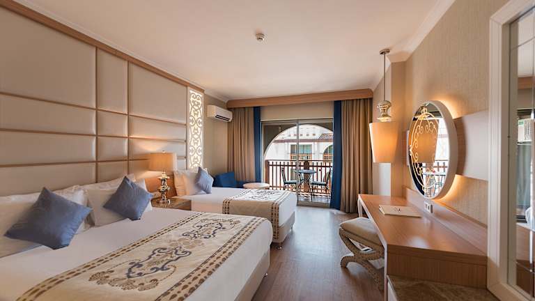 Quattro Beach Spa&Resort Hotel verfügt über 438 Zimmern und davon sind 326 Standardzimmern, 40 Verbindungszimmern, 64 Familienzimmern, 4 Barrierefreie Zimmern, 2 Prinzessensuite und 2 Königssuite, welche für Ihr Komfort konzipiert und geschmacksvoll eingerichtet sind. Alle unsere Zimmern sind Standard mit Klimaanlage mit Wärme/Kälte-Split, Telefon, Föhn, Wasserkocher, Minibar, TV mit Satteliten und USB-Anschluss, Kabelloses Internetverbindung, Kartenschlüssel, Sicherheitssystem, elektronische Safe, Feuermelder und Telefon im Badezimmer. Alle unsere Zimmer verfügen über Balkone, überwiegend mit Meerblick. Alle Zimmer sind mit Wandtapeten, Laminatboden und Nasszellen mit Keramik ausgestattet.
