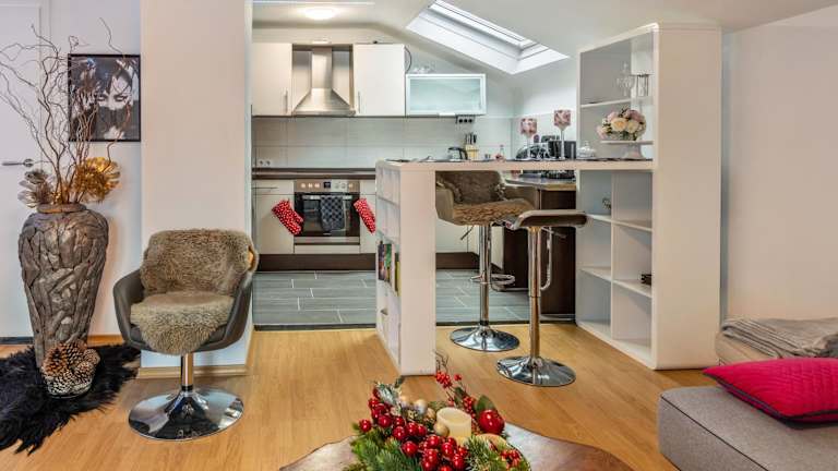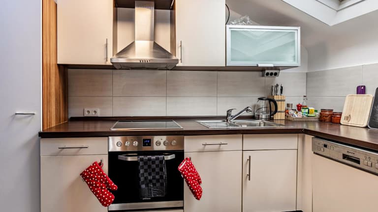 Die Ferienwohnung verfügt über eine gut ausgestattete Küche, die mit einem Kühlschrank und einem Geschirrspüler ausgestattet ist, um die Selbstverpflegung zu ermöglichen.