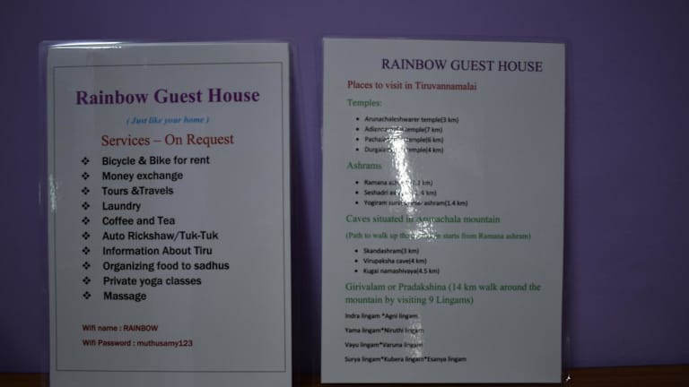 Das Rainbow Guest House Tiruvannamalai in Tiruvannamalai bietet kostenfreies WLAN, eine Terrasse und haustierfreundliche Unterkünfte. Mit Privatparkplätzen vor Ort können Sie bequem anreisen. Die Zimmer bieten einen herrlichen Blick auf die umliegenden Berge und laden mit einem gemütlichen Sitzbereich zum Entspannen ein. Jedes Zimmer verfügt über ein eigenes Badezimmer mit Dusche. Das freundliche Personal steht Ihnen rund um die Uhr an der Rezeption zur Verfügung. Zusätzlich werden Fahrradverleih und Autovermietung angeboten. Der nächstgelegene Flughafen Puducherry befindet sich 88 km entfernt.