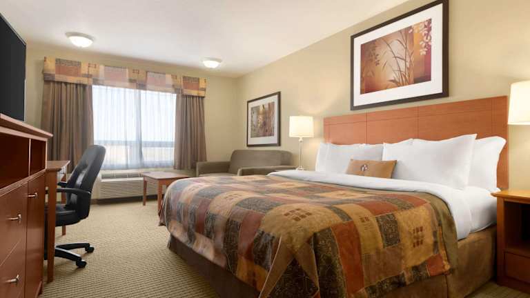 Das Ramada by Wyndham Drayton Valley ist ein günstig gelegenes Hotel, das seinen Gästen einen angenehmen Aufenthalt bietet. Mit einem Innenpool inklusive Wasserrutsche, modernen Zimmern und kostenfreiem WLAN ist das Hotel ideal für einen komfortablen Aufenthalt. Genießen Sie das kostenlose warme Frühstück, trainieren Sie im Fitnesscenter oder entspannen Sie im Whirlpool. Das Hotel bietet auch ein Spielezimmer, ein Businesscenter und Wäschemöglichkeiten. In der Umgebung können Sie Golf spielen oder das Drayton Valley Indoor Rodeo besuchen.