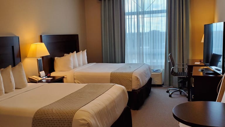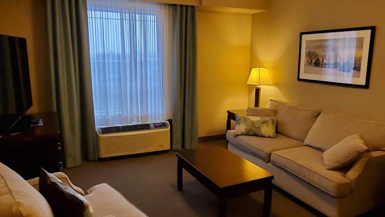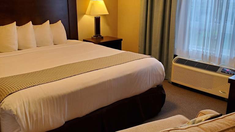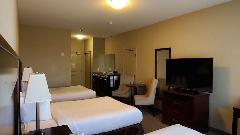Die Zimmer im Ramada by Wyndham Emerald Park/Regina East sind mit Klimaanlage und Heizung ausgestattet und verfügen über ein Doppelbett oder ein Sofabett. Eine Kochnische mit Kühlschrank, Herd, Mikrowelle und Tee-/Kaffeekocher ist vorhanden. Zur Ausstattung gehören ein Schreibtisch, ein TV-Gerät, WiFi ohne Gebühr sowie ein Badezimmer mit Dusche, Badewanne oder Whirlwanne und Haartrockner. Rollstuhlgerechte Zimmer sind ebenfalls verfügbar.
