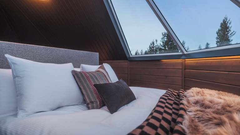 Die Hütten im Northern Lights Huts sind gemütlich und komfortabel eingerichtet und bieten einen Sitzbereich, einen Wasserkocher und einen Kühlschrank. Jede Hütte verfügt über ein eigenes Bad mit Dusche, Haartrockner, Bademänteln und kostenlosen Pflegeprodukten. Das Highlight der Hütten ist das Glasdach, das Ihnen einen unvergleichlichen Blick auf das Nordlicht in klaren Winternächten bietet.