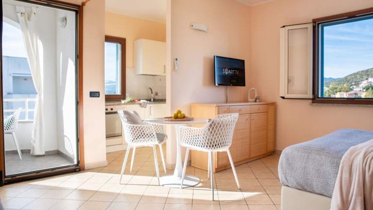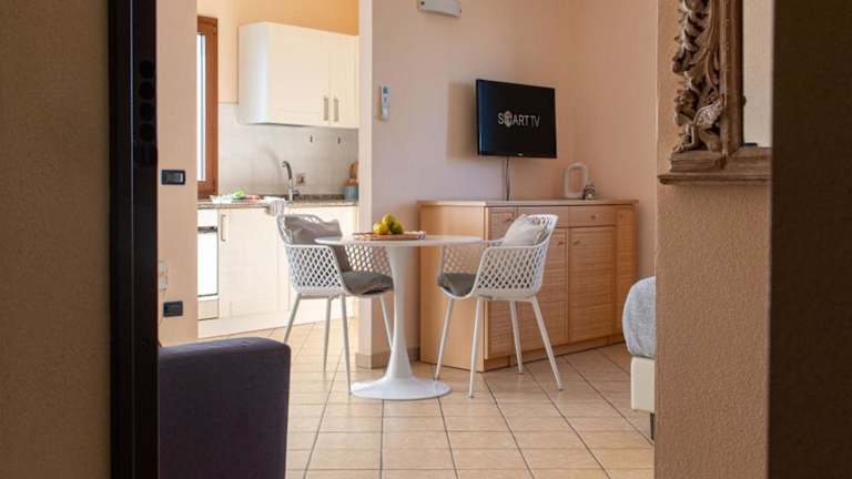 Die Ferienwohnung umfasst ein Schlafzimmer, ein Wohnzimmer, eine voll ausgestattete Küche mit Kühlschrank und Kaffeemaschine sowie ein Badezimmer mit Bidet und Dusche. Handtücher und Bettwäsche sind im Angebot enthalten.