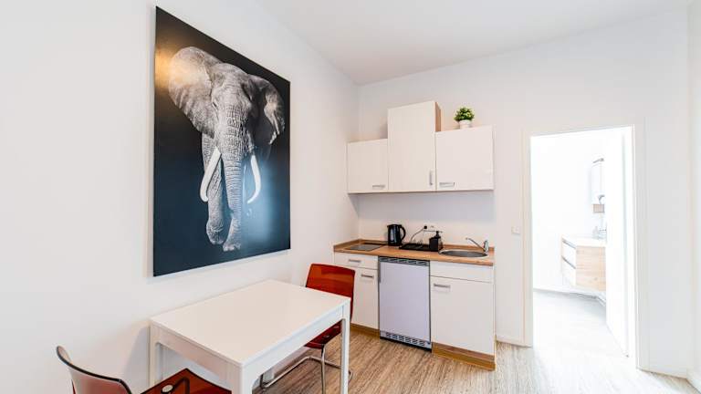 In jeder Wohneinheit steht eine voll ausgestattete Küche zur Verfügung, die einen Esstisch, einen Kühlschrank, eine Herdplatte und einen Wasserkocher umfasst, was Selbstverpflegung ermöglicht.