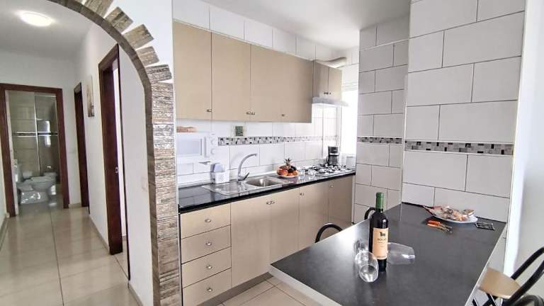 Die Ferienwohnung umfasst zwei Schlafzimmer, ein Badezimmer, Bettwäsche, Handtücher, einen Flachbild-TV, einen Essbereich, eine voll ausgestattete Küche und eine Terrasse mit Blick auf die Stadt.
