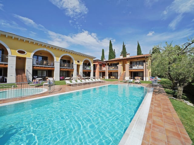 Ferienanlage mit Pool in Garda, ungefähr 400 Meter vom See entfernt. Ruhig gelegen, mit privatem Ambiente, aber in unmittelbarer Zentrumsnähe.