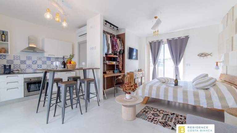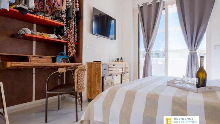 Die klimatisierten Unterkünfte der Residence Costa Bianca bieten alles, was Sie für einen komfortablen Aufenthalt benötigen. Jede Unterkunft verfügt über einen Balkon, auf dem Sie die frische Luft und die Aussicht genießen können. Im Inneren finden Sie einen gemütlichen Sitzbereich mit einem Flachbild-TV. Die voll ausgestattete Küche bietet einen Kühlschrank, einen Backofen, ein Kochfeld, eine Kaffeemaschine und einen Wasserkocher. Das private Badezimmer ist mit einer Dusche und einem Haartrockner ausgestattet. Kostenloses WLAN steht Ihnen in allen Bereichen der Unterkunft zur Verfügung.