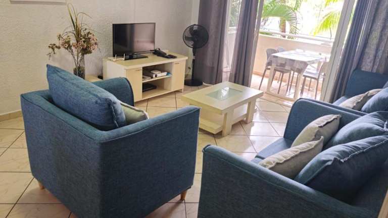 Die Ferienwohnung in der Residence les Orchidees umfasst zwei Schlafzimmer, ein Wohnzimmer, einen Flachbild-TV und eine gut ausgestattete Küche mit einer Mikrowelle. Es gibt zwei Badezimmer mit Dusche und eine Terrasse mit Blick auf den Garten.