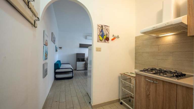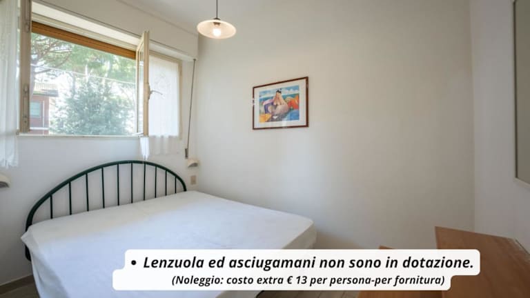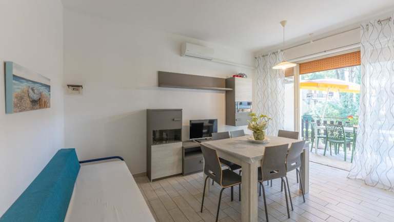 Die Ferienwohnung bietet einen Balkon mit Gartenblick, ein Schlafzimmer sowie ein Wohnzimmer. Die Ausstattung umfasst eine Klimaanlage, eine voll ausgestattete Küchenzeile mit Kühlschrank und Kaffeemaschine sowie ein Badezimmer mit Bidet und Dusche. Auf Anfrage sind Handtücher und Bettwäsche gegen Aufpreis verfügbar.