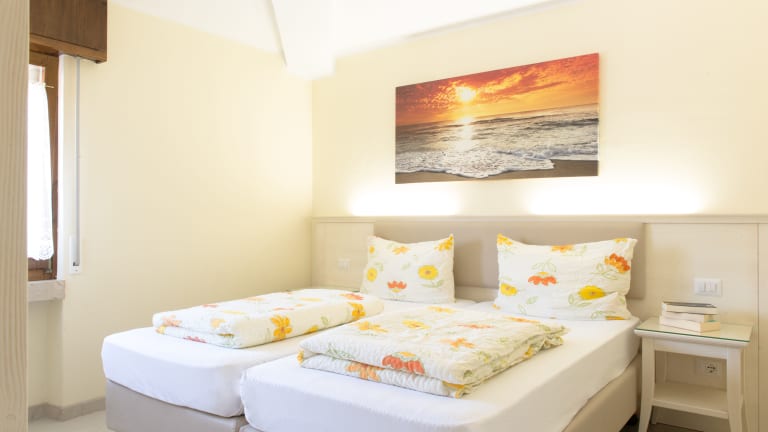 Typ A: Zweizimmerwohnung, 30/38 Quadratmeter, Wohnzimmer mit Schlafcouch, 1 Schlafzimmer mit Doppelbett, Badezimmer mit Dusche; Balkon. Typ A-Plus: Klimatisierte 2-Zimmer-Wohnung, 40 Quadratmeter neu gebaut, 1 Schlafzimmer mit Doppelbett, Wohnbereich mit Kochnische und ausziehbares Doppelsofa, Badezimmer, große Terrasse, TV-Sat, Safe. Geschmackvoll eingerichtet, sehr gut ausgestattet, mit Wasch- und Spülmaschine, Backofen, Mikrowelle, Bügeleisen und Fön. Typ B: Dreizimmerwohnung, 55/65 Quadratmeter mit großem Wohnzimmer, zwei Schlafzimmern mit Doppelbett und Kajütenbett oder mit zwei Doppelbetten, Badezimmer mit Dusche; Balkon oder Terrasse. Typ B plus: Klimatisierte Dreizimmerwohnung, neu gebaut, 55/65 Quadratmeter mit großem Wohnzimmer, zwei Schlafzimmern mit Doppelbett und Kajütenbett oder mit zwei Doppelbetten, Badezimmer mit Dusche; Balkon oder Terrasse. Geschmackvoll eingerichtet, sehr gut ausgestattet, mit Wasch- und Spülmaschine, Backofen, Mikrowelle, Bügeleisen und Fön. Typ C: Dreizimmerwohnung, frisch umgebaut nach moderner Denkweise. So eingerichtet, dass bis zu 8 Personen oder zwei Familien Platz finden, daher großflächig: 75/80 Quadratmeter, großes Wohnzimmer, zwei Schlafzimmer mit Doppelbett und Kajütenbett, zweites Badezimmer verfügbar, große Terrasse.
