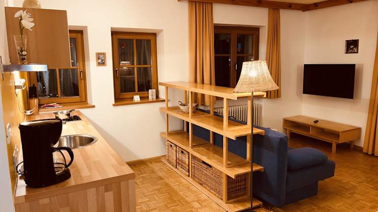 Die Ferienwohnung verfügt über 1 Schlafzimmer, ein Wohnzimmer mit TV, eine gut ausgestattete Küche mit Kühlschrank und Geschirrspüler sowie ein Badezimmer mit Dusche. Handtücher und Bettwäsche werden bereitgestellt und ein Balkon mit Bergblick ist vorhanden.