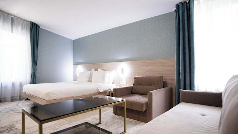 Das Resident Hotel Deluxe in Almaty bietet Ihnen einen komfortablen Aufenthalt in der Nähe des Stadtzentrums. Mit kostenfreiem WLAN und Privatparkplätzen genießen Sie hier eine stressfreie Unterkunft. Die Zimmer sind modern und gemütlich eingerichtet und verfügen über Annehmlichkeiten wie Klimaanlage, Kühlschrank und Flachbild-Sat-TV. Das Hotelrestaurant bietet Ihnen eine Vielzahl von Speisen, und in der Umgebung finden Sie zahlreiche weitere gastronomische Einrichtungen. Mit der U-Bahn-Station in der Nähe und dem Bahnhof Almaty-2 in der Umgebung ist das Hotel gut angebunden. Der internationale Flughafen Almaty ist ebenfalls leicht zu erreichen.