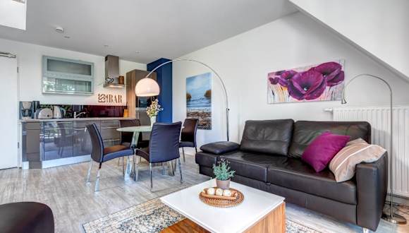 Die Residenz am Balmer See - Fewo 70 in Balm bietet eine komfortable Unterkunft mit einer gut ausgestatteten Küchenzeile und modernen Annehmlichkeiten. Gäste können auch die Sauna und das Fitnesscenter nutzen sowie Fahrräder ausleihen, um die Umgebung zu erkunden.