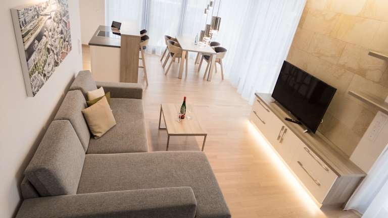 Die Studios und Apartments im Residenz am Zwinger sind stilvoll eingerichtet und verfügen über maßgefertigte hochwertige Möbel. Jede Wohneinheit hat einen eigenen Balkon oder eine Terrasse, wo Sie die frische Luft genießen können. Die Küchen sind voll ausgestattet, so dass Sie Ihre eigenen Mahlzeiten zubereiten können. Die Bäder sind modern und verfügen entweder über eine ebenerdige Dusche oder eine Whirlpool-Badewanne. Für zusätzlichen Komfort gibt es Fußbodenheizung, eine Waschmaschine und einen Wäschetrockner. Die Kingsize-Betten sorgen für eine erholsame Nachtruhe.