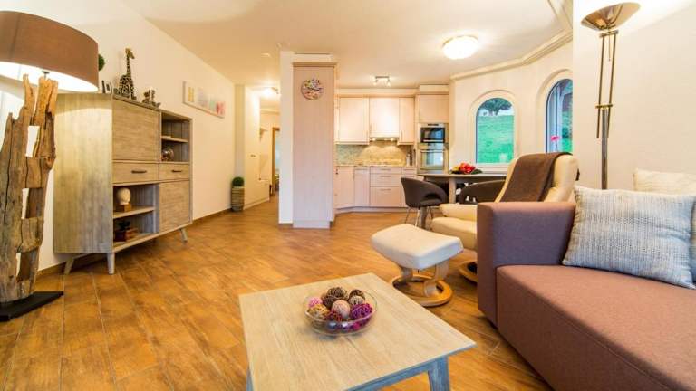 Die Ferienwohnung verfügt über zwei Schlafzimmer, zwei Badezimmer mit Dusche und Haartrockner sowie eine gut ausgestattete Küche mit Kühlschrank, Geschirrspüler und Ofen. Ausgestattet ist die Wohnung weiterhin mit einem Satelliten-Flachbild-TV und bietet Zugang zu einem Balkon und einer Terrasse.