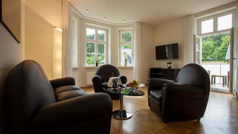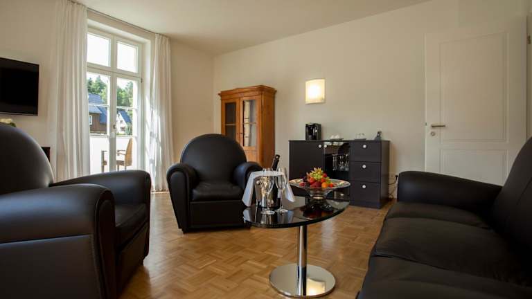 Die Suiten der Residenz Itterbach sind exklusiv und stilvoll eingerichtet und bieten Ihnen ein hohes Maß an Komfort. Jede Suite verfügt über eine Klimaanlage, einen Flachbild-Sat-TV, ein iPad und eine iPod-Dockingstation. Zur weiteren Ausstattung gehören eine Minibar und eine Kaffeemaschine. Das eigene Bad ist mit Bademänteln ausgestattet und Handtücher werden gestellt.